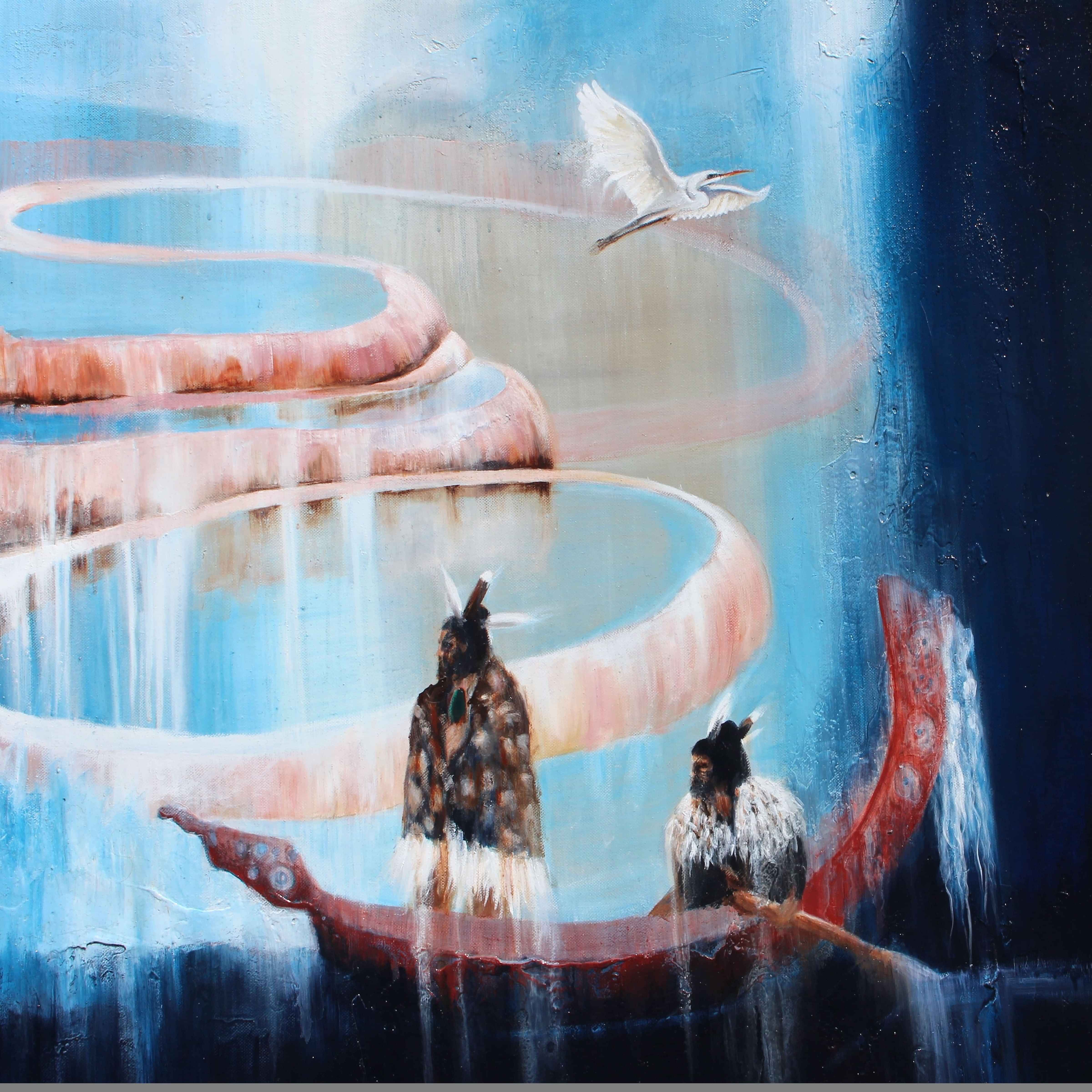 This painting depicts the tragic ending of the Pink and White Terraces in Tarawera, New Zealand. From 1840 this sacred treasure and 8th Wonder of the World attracted ‘moneyed people’ from afar. £10 (today £1070) included an experience with the Tuhourangi Maori tribe, a canoe ride, steamed potato and crayfish lunch by the pools of the glistening silica white terraces followed by a mineral bath in the scalloped walls of the pink pools. Stunning water hues never seen before, a powerful place of healing, restoration and rebalance. A prophet called Tuhoto watched the tribe become demoralised by alcohol and greed. The tribe’s Chief replaced the maraes carved ancestor’s paua shell eyes with gold sovereigns. April 1886, Tuhoto warned the tribe that their disrespect for ancestral values would have fateful consequences but still the rules of tapu were disobeyed. 31st May, tourists claimed they saw a waka paddled by Maori ancestors, their heads transformed into dog’s heads, before disappearing. Tuhoto saw this as a sign and told people to flee. Eleven days later on 10 June Mt Tarawera violently erupted sending massive red boulders into the sky with mud and ash burying the pink and white terraces and the prosperous future was forever lost.
